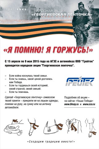 В рамках Народной акции с 15 апреля по 9 мая на АГЗС и автомойках ООО «Грейтек» будут выдаваться Георгиевские ленточки.