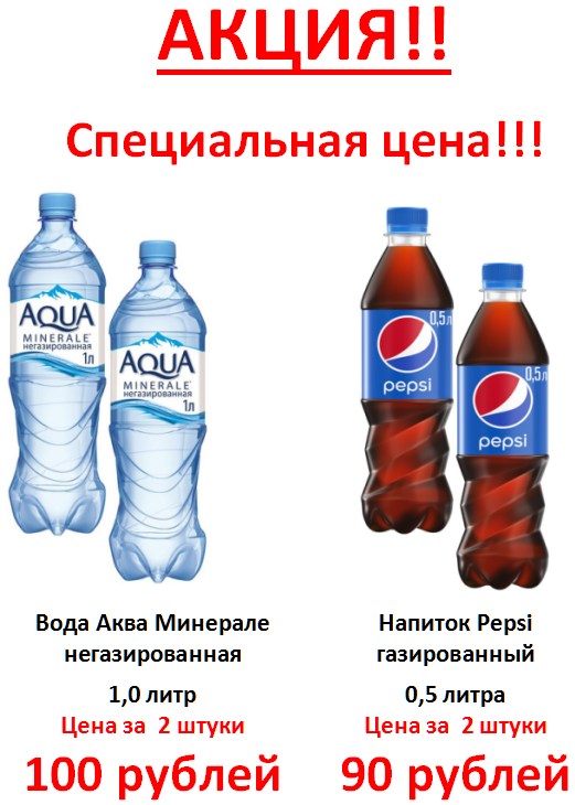 «Аква Минерале» — питьевая вода, которая перед розливом проходит 7(семь!!!) степеней очистки, что обеспечивает ее удивительно свежий, приятный и мягкий вкус. Прекрасно подходит для восстановления водного баланса организма. "Классический Пепси" не нуждается в дополнительном представлении. Пепси Кола - легендарный напиток, изобретенный фармацевтом из Северной Каролины(США) Калебом Брэдемом в 1893 году. Pepsi завоевал популярность по всему миру. Акция проводится в магазине на АГЗС "Грейтек" по адресу: Срок акции до 31 декабря 2019 года. Счастливой дороги! Приезжайте к нам еще!