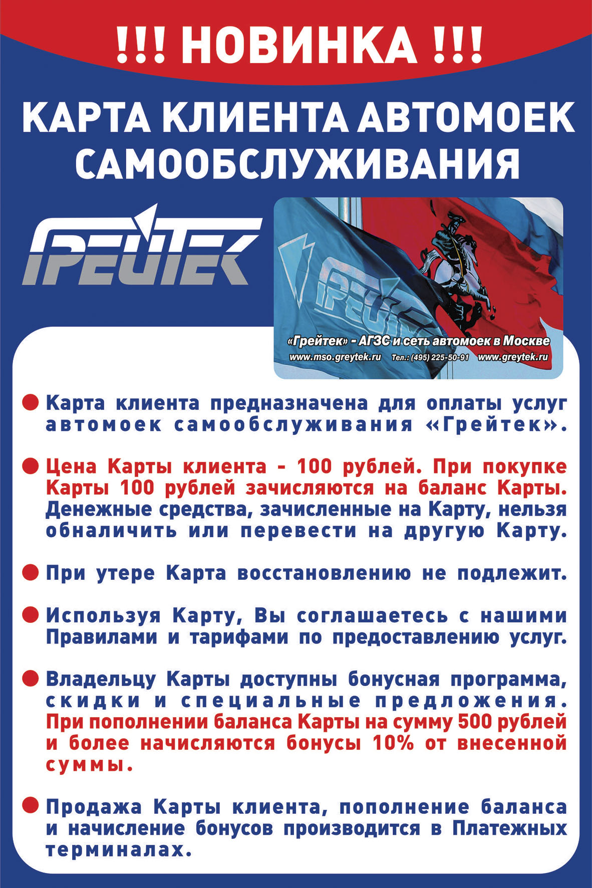 ВНИМАНИЮ КЛИЕНТОВ АВТОМОЕК САМООБСЛУЖИВАНИЯ "ГРЕЙТЕК"!!!С 15 сентября 2020 года на автомойке №7 компании "Грейтек" вводятся в оборот Карты клиента! Карта клиента представляет собой пластиковую карту стандартного размера с магнитным чипом, на котором записана информация о персональном балансе Клиента, в пределах которого можно оплатить услуги на автомойках самообслуживания(МСО) "Грейтек". Приобрести и пополнить Карту клиента можно в платежных терминалах на МСО "Грейтек" за наличный расчет и по банковской карте. Преимущества карты: